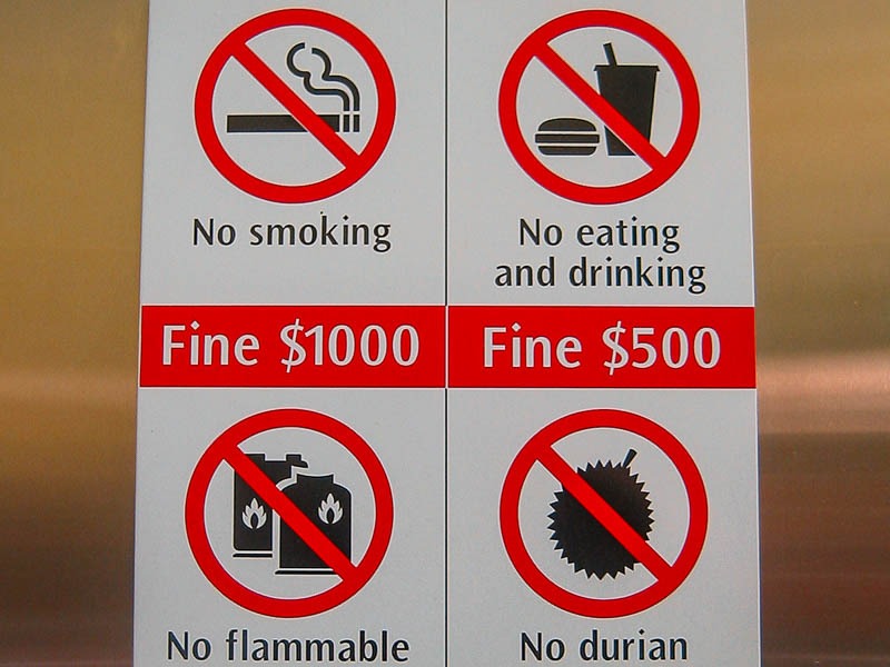 Fumar: Apenas em áreas designadas; multa de SGD 1.000 fora delas, com trabalho comunitário para reincidentes.